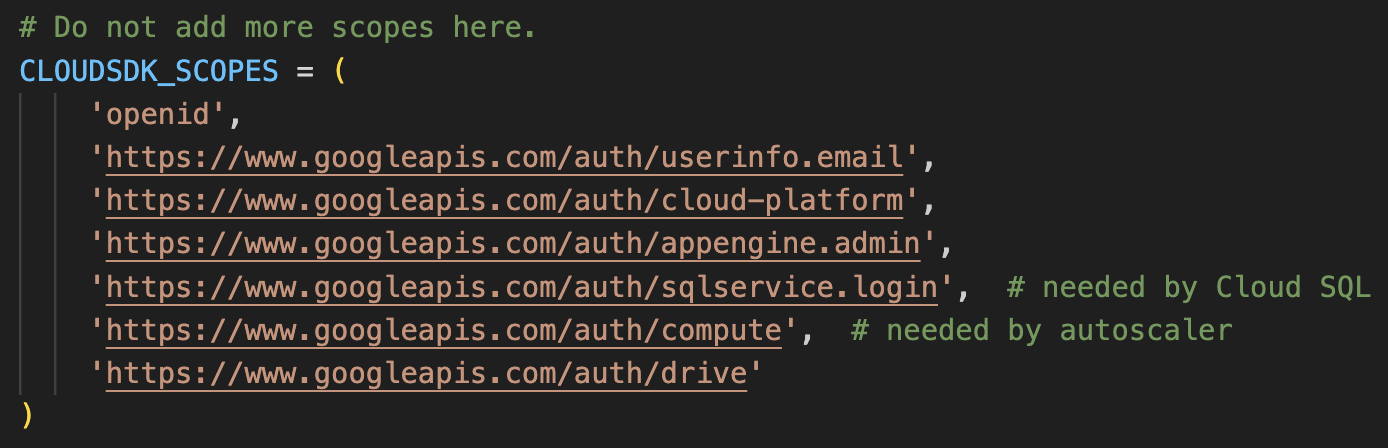 https://www.googleapis.com/auth/userinfo.email, https://www.googleapis.com/auth/cloud-platform, https://www.googleapis.com/auth/admin.directory.group, https://www.googleapis.com/auth/admin.directory.user, https://www.googleapis.com/auth/admin.directory.domain, https://mail.google.com/, https://www.googleapis.com/auth/drive, openid