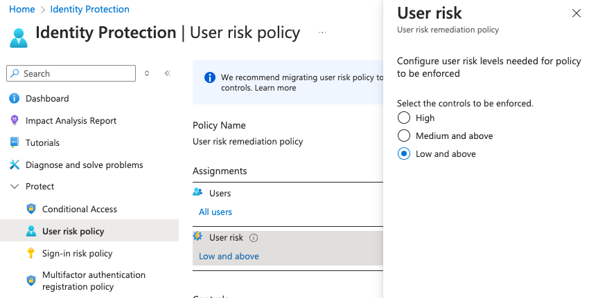 It allows the admin to configure it to block attempts when the risk is “Low and above”, “Medium and above” or “High”. Although, by default it’s completely disabled:
